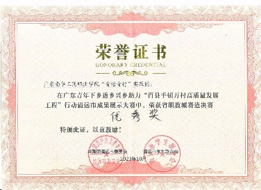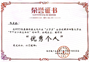 2022-2023学年,获暑期科技文化卫生“三下乡”社会实践活动暨大学生“百千万工程突击队”行动广东南华工商职业学院“优秀个人”称号;