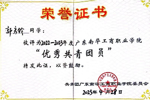 2022-2023学年,获广东南华工商职业学院“优秀共青团员”称号;