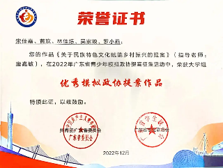 2022年12月,获广东省青少年模拟政协提案征集活动(大学组,优秀模拟政协提案作品);