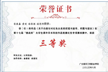 2023年3月,获第十七届“挑战杯”广东南华工商职业学院大学生课外学术科技作品校赛二等奖;