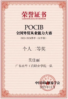 2022-2023年,获第十三届POCIB全国外贸从业能力大赛团体一等奖和个人二等奖;