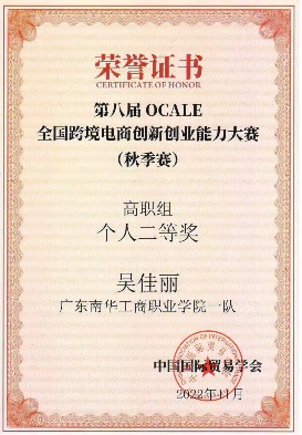 2022-2023年,获第八届OCALE全国跨境电商创新创业能力大赛(秋季赛)团体和个人二等奖;