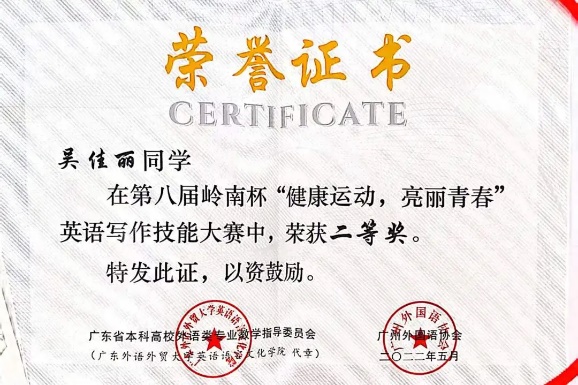 2022-2023年,获广东省第八届岭南杯“健康运动,亮丽青春”英语写作技能大赛二等奖。