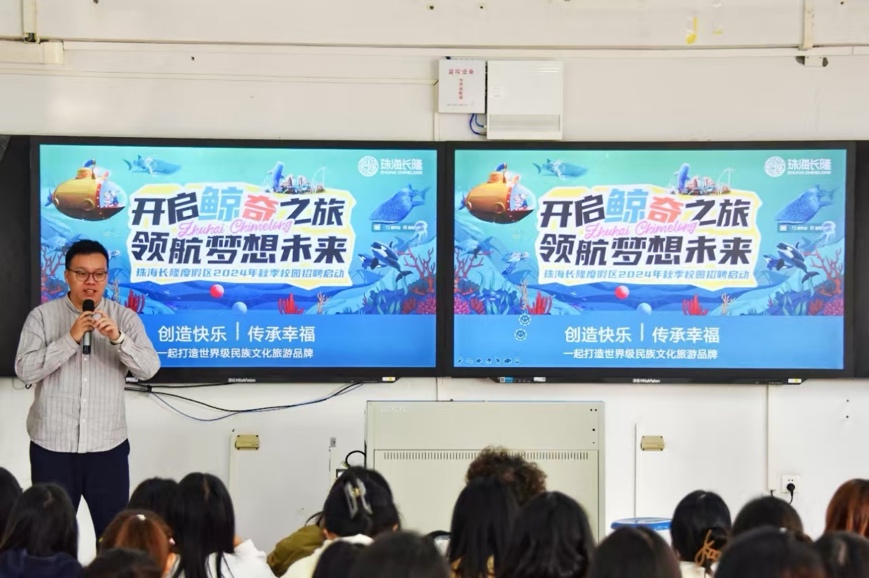 珠海长隆投资发展有限公司人事主管刘健现场讲解了长隆集团的全面薪酬福利待遇体系、岗位的职业和具体要求,同时也分享缤纷多彩的员工活动。同学们积极互动,纷纷提问,热情饱满。