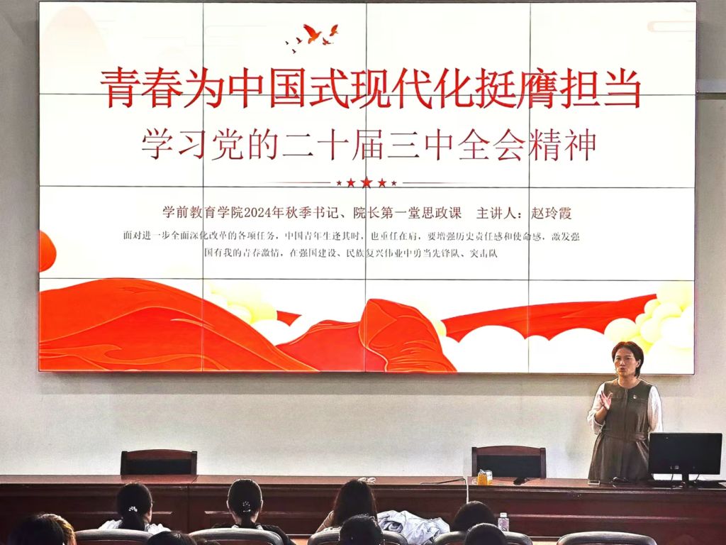 10月10日,学前教育学院副院长赵玲霞讲授了主题为“青春为中国式现代化挺膺担当”的2024年秋季学期第一堂思政课,引领学生深入学习领会党的二十届三中全会精神,激励青年学子在强国建设、民族复兴伟业中勇当先锋队、突击队。