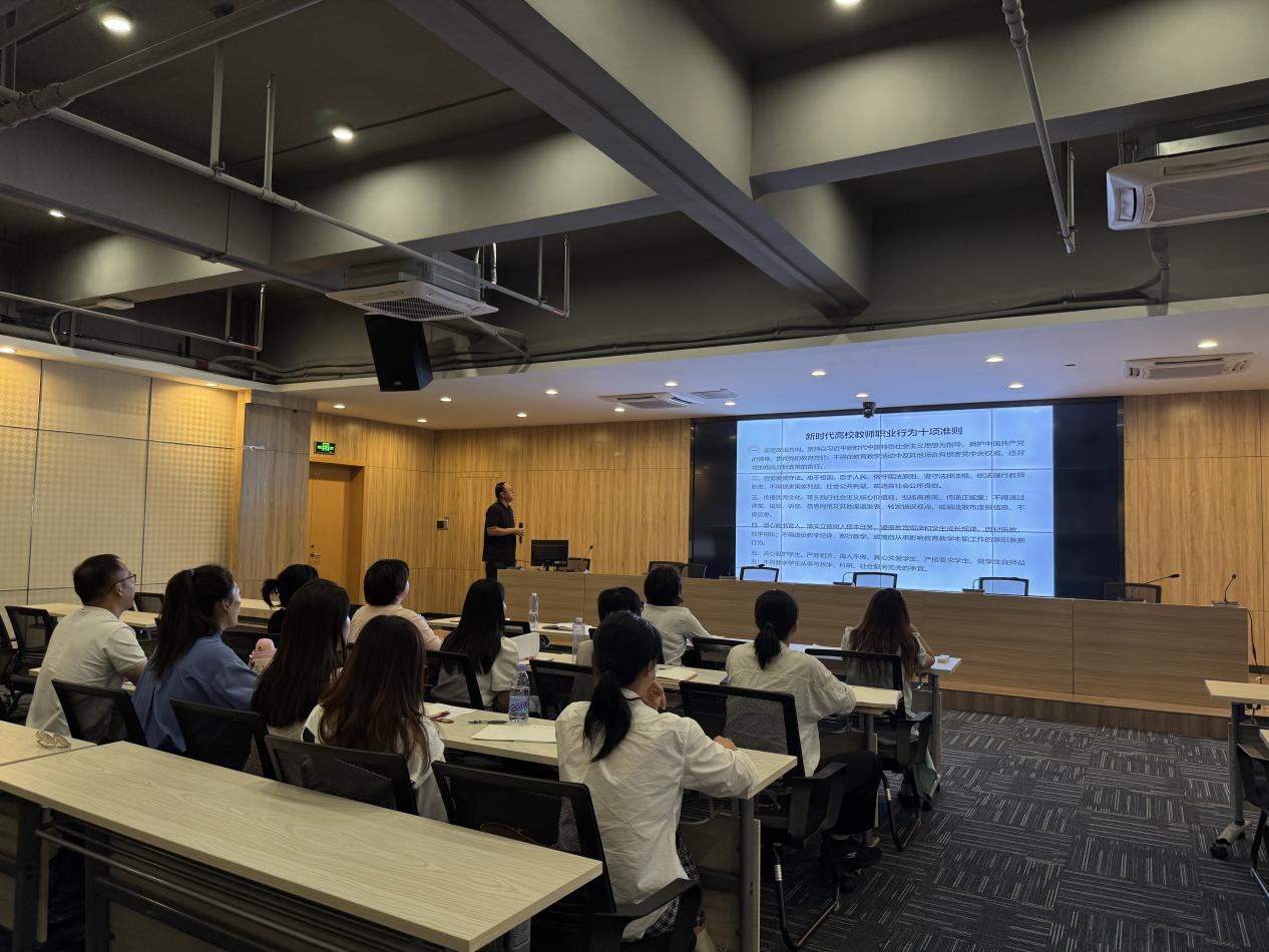 许典榕、赵玲霞带领全体教职工学习并共读了《新时代高校教师职业行为十项准则》。该十项准则涵盖了政治方向、爱国守法、传播优秀文化、潜心教书育人、关心爱护学生、坚持言行雅正、遵守学术规范、秉持公平诚信、坚守廉洁自律以及积极奉献社会等多个方面,对教师的职业操守和行为规范提出了明确要求。