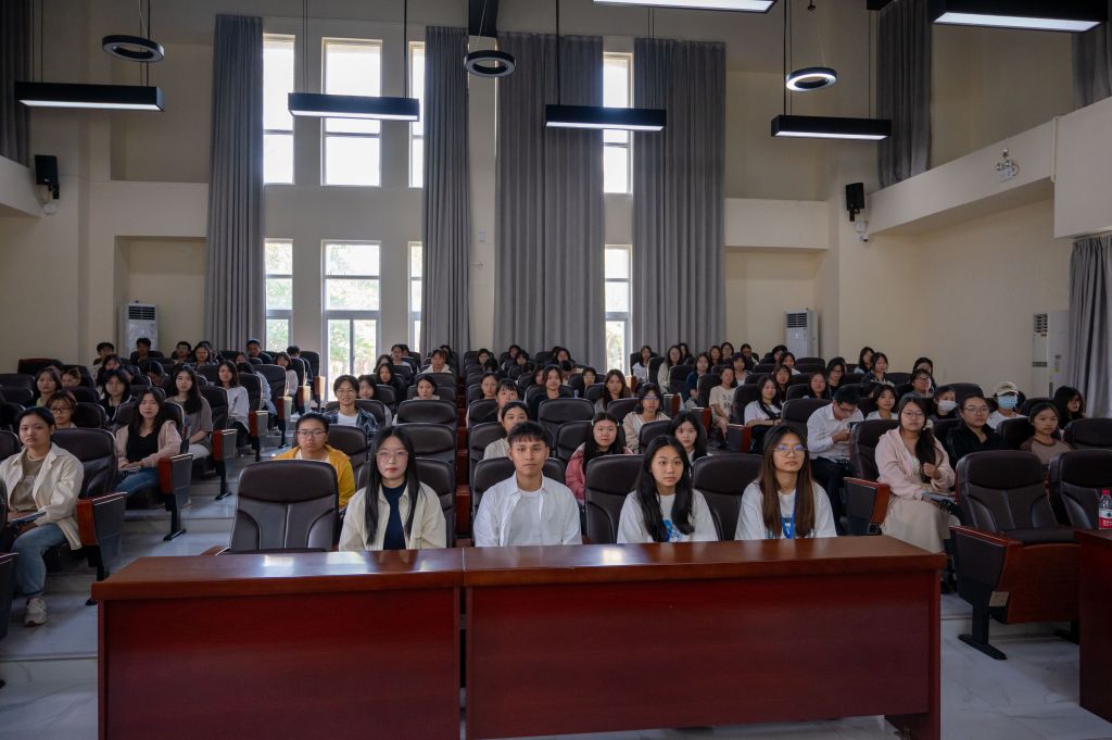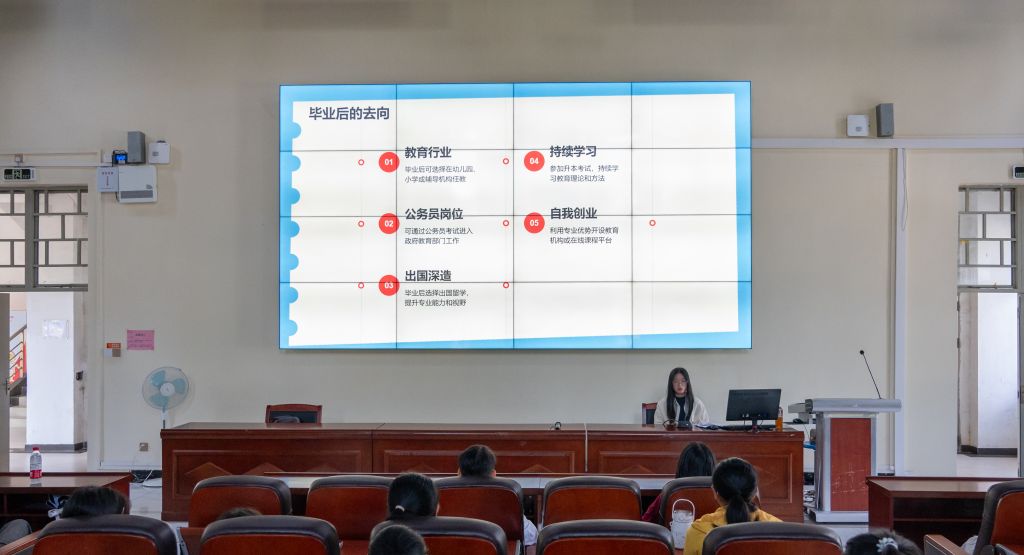 职业发展与规划方面。龙嘉伶向同学们介绍了毕业后的职业选择,包括在教育行业任教、参加公务员考试、出国深造以及自我创业等,并提醒同学们要根据自己的兴趣和特长,制定合理的职业规划,并为之努力奋斗。