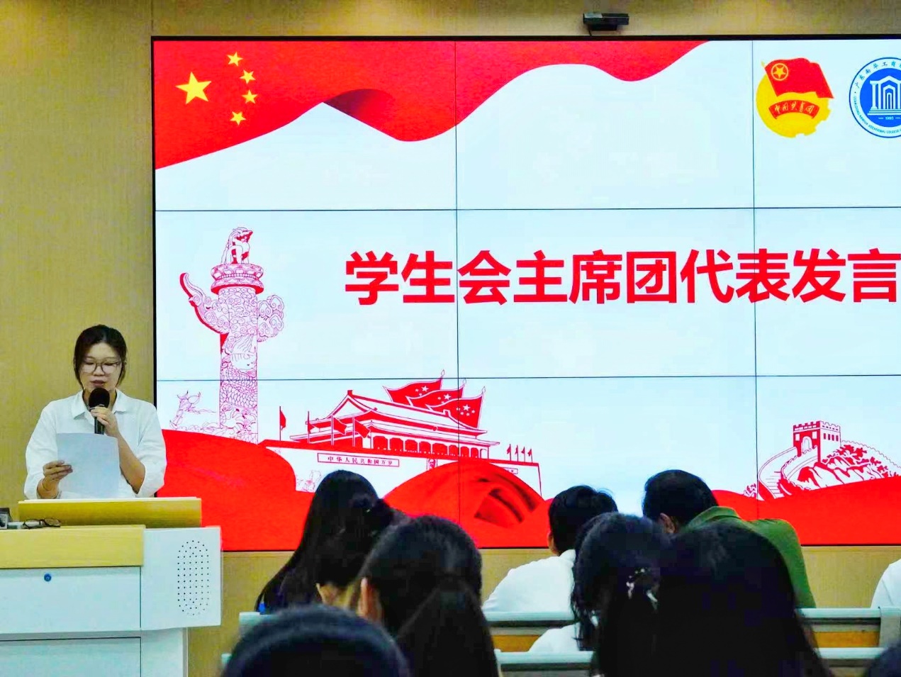 黄子榕代表学院团学组织分享了在服务学院和同学工作过程中的收获与体会。她表示,学院团委、学生会将更加饱满的热情,主动倾听同学需求、加强团队协作、策划精品活动,更好地服务同学、奉献校园。