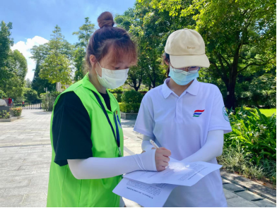 (图为初心励行队队员对当地居民及游客进行调查问卷)