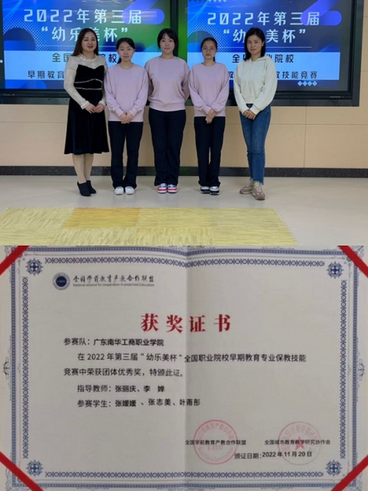 从10月报名参赛到省赛选拔再到11月17日的国赛,学院领导高度重视,鼎力支持。由2021级早期教育专业学生叶雨彤、张志美、张媛媛组成的参赛团队,在指导教师张丽庆、李婵的全程跟进指导下,最终荣获国赛团体优秀奖。