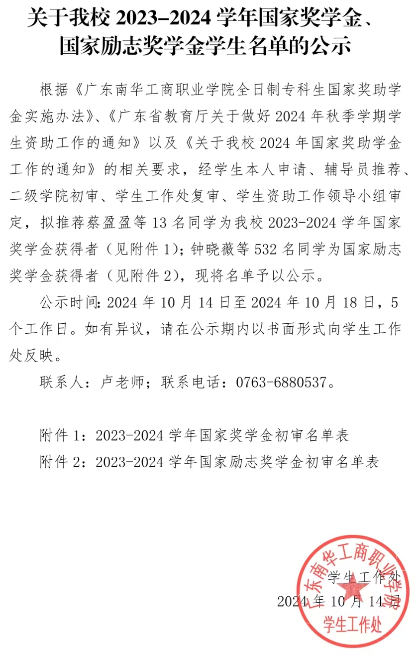 关于我校 2023-2024 学年国家奖学金、国家励志奖学金学生名单的公示