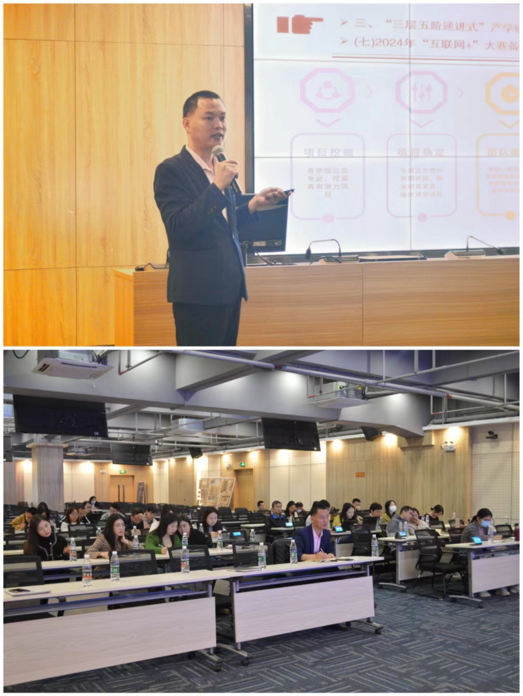 黄品老师从学校党委印发的 《铸魂逐梦工程——新时代广东南华工商职业学院学生工作高质量发展行动方案(2023-2025)》出发 ,强调“用劳模精神感召人、用劳动精神培养人、用工匠精神铸造人”的特色育人理念,围绕“三层五阶递进式”产学研育——高职院校创新创业教育高质量发展的路径探索”为题展开分享。分享从回顾“南华创新创业教育1.0(2019-2022) ‘五阶递进式’学研育”进行总结分析经验,探索“南华创新创业教育2.0(2023-2025) ‘三层五阶递进式’产学研育”实施路径,呼吁参会教师积极参与到学校创新创业教育事业,在学校创新创业教育事业高质量发展中长才干、做贡献。同时会上还与老师们分享了“互联网+”“挑战杯”等大赛备赛参赛经验,鼓励老师们积极参赛。