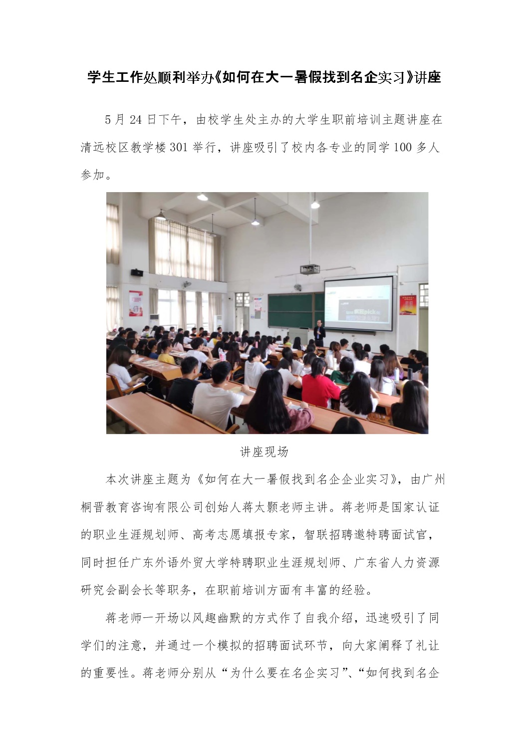 学生工作处顺利举办《如何在大一暑假找到名企实习》讲座
