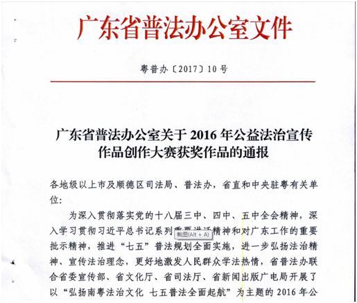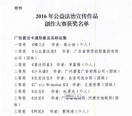 根据《广东省普法办公室关于2016年公益法治宣传作品创作大赛获奖作品的通报》(粤普办[2017]年10号),我校建艺学院15级广告1班学生高小迪参赛作品《棉儿》荣获“广东普法卡通形象及名称征集组”一等奖(指导老师徐丹);建艺学院15级广告1班学生黄伟鸿参赛作品《阿武》荣获“广东普法卡通形象及名称征集组”三等奖(指导老师徐丹)。