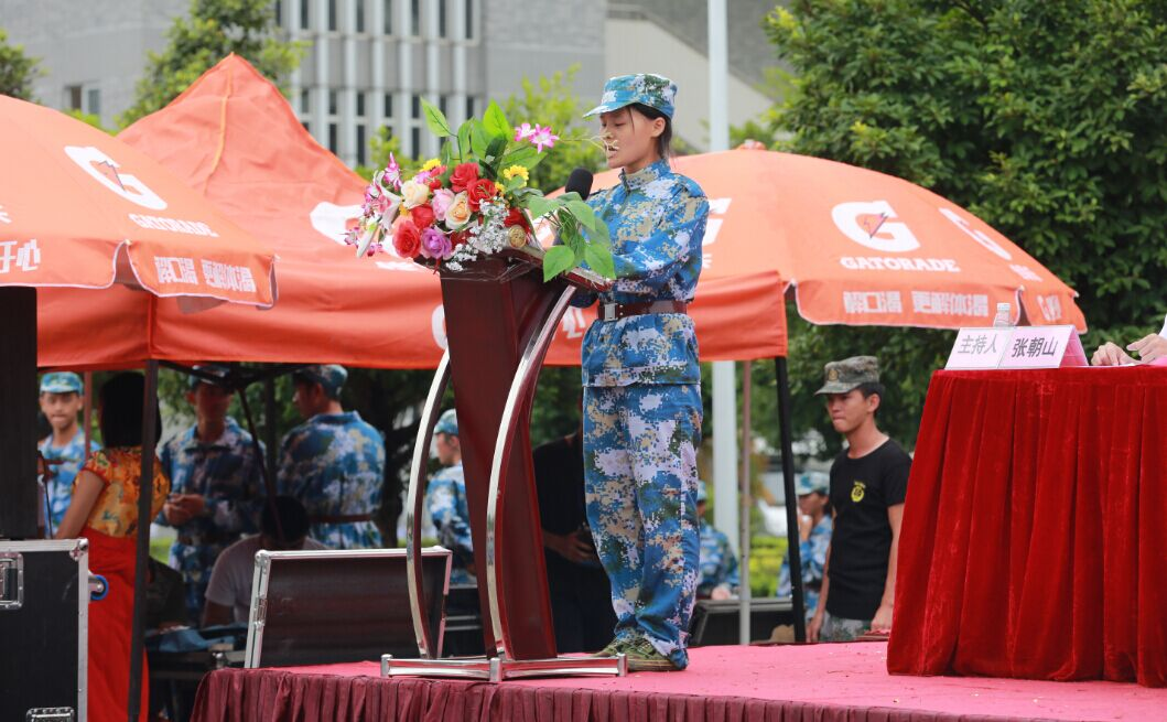 随后,大会进行第一项议程:全体师生合唱《中华人民共和国国歌》,全体师生精神振奋,歌声嘹亮,响彻云霄。大会第二项议程:军训总结表彰。其一、承训单位张永鑫主任对8天的军训作了总结,张主任对新生在军训中取得的成绩表示衷心的祝贺,并鼓励新生要把这种不怕苦、不怕累的精神带到以后的学习和生活中,一直弘扬下去。其二、学院院长助理、清远校区综合办韦秀华主任宣读了“2015级学生军训优秀连队、优胜方阵、最佳表演方阵、优秀组织奖及优秀学员的获奖名单”。其三、现场进行盛大的颁奖仪式。其四、信息工程与商务管理学院刁丽蓉同学代表优秀学员发言,她在发言中庄严承诺:在日后的学习、生活和实践中,铭记教诲,在新的起点再创辉煌。