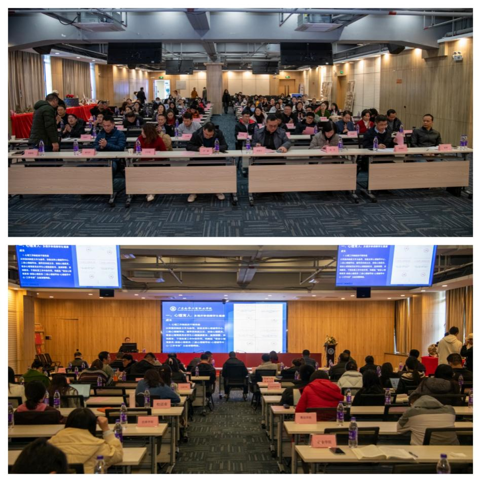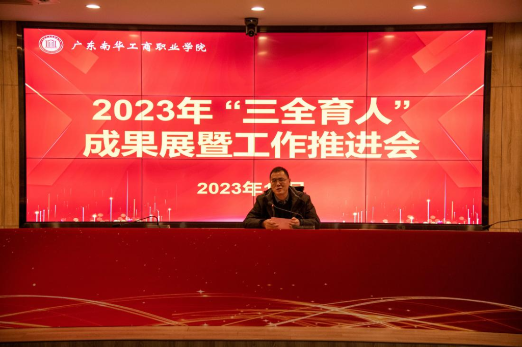 为全面展示2023年“三全育人”成果,总结工作情况,交流分享经验,谋篇布局下一阶段“三全育人”工作,12月25日下午,学校在清远校区图书馆方形报告厅举行“三全育人”成果展暨工作推进会。学校党委副书记、副校长严新,党委委员、学生工作部部长余喜文出席会议,各行政部门、二级学院主要负责人,各二级学院学生工作负责人、系主任和专业负责人、辅导员,相关职能部门工作人员以及2023年“铸魂逐梦工程”三全育人精品培育项目组成员等参加会议。会议由学生工作处副处长李小宁主持。
