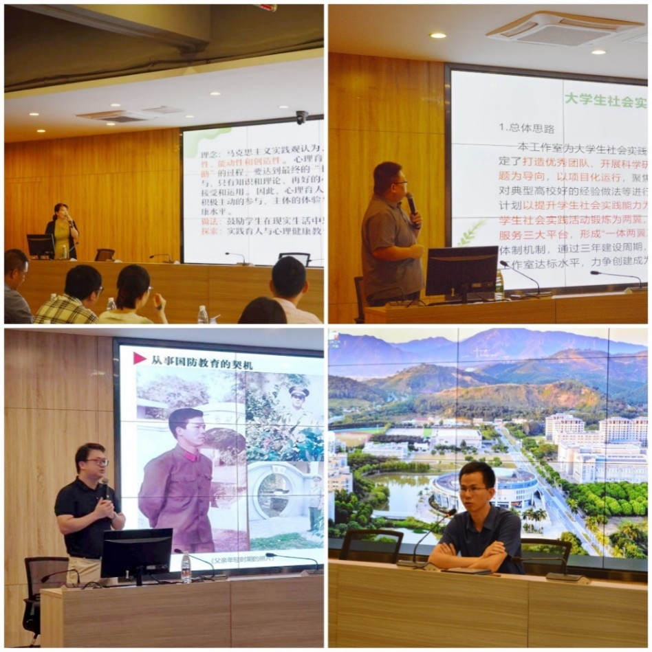 活动中,“护心、筑梦”辅导员工作室、“大学生国防教育与征兵”辅导员工作室、“大学生社会实践指导”辅导员工作室的主持人分别介绍了工作室建设情况、成果成效、不足和建设心得。章小剑老师表示后续将按照实践与心理协同育人方向,继续立足工作室建设实际,进一步加强工作室的规范建设、成果凝炼探索;杨力铖老师通过个人成长经历、实践与摸索以及戍边烈士的故事展开,呼吁大家今后进一步加强对大学生进行国防教育,培养大学生的责任感和使命感;邱伟波老师详细介绍工作室成员参与竞赛与活动的情况,并详细分析建设过程中存在的问题与解决措施,并表示将在优化团队人员配备提升平台软硬件设备及竞争省级骨干辅导员工作室上继续努力。