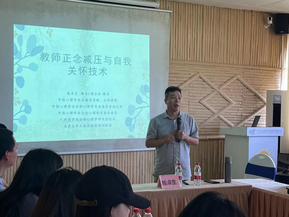 培训课程一:由中国政法大学博士、中科院心理所博士后、澳门大学博士后、北京大学访问学者、广州商学院法律心理学研究院院长陈卓生为参训人员开展“教师正念减压与自我关怀技术”专题讲座。讲座中,陈博士深入浅出地介绍正念减压技术的机制以及“STPO技术”“调心RAIN技术”等,强调辅导员老师是学生心理健康的重要支持者和帮助者,掌握相关技能才能更好地引导和服务好学生。在互动环节,陈卓生博士带领老师们练习正念呼吸和身体感知,引导老师们掌握如何让人的情绪在短时间内变得平静、放松,老师们普遍反馈方法有效。