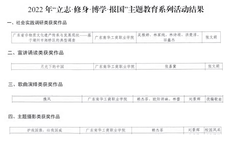 根据《广东省教育厅关于公布2022年“立志修身博学报国”主题教育系列活动结果的通知》,我校应用法学与公共事业学院张文娟教师指导,吴雅婷团队的作品《广东省非物质文化遗产传承与发展现状—基于潮州市湘桥区的典型调查》获得社会实践类三等奖,由张文娟教师指导,张嘉冀同学的作品《月光下的中国》获得音频诵读类二等奖;由学前教育学院刘景辉老师指导,赖杰菲同学的作品《护我国旗,壮我国威》获得主题摄影类一等奖,由刘景辉老师指导,赖杰菲团队的作品《携风》获得歌曲演绎类三等奖。