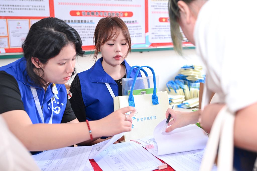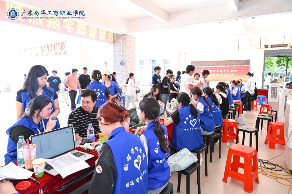 各二级单位结合专业特色,打造了一批“有新意、有温度、有专业味”的迎新活动。校团委邀请省劳模王原鹏和张扬娣现场展示茶艺,让新生领略传统文化的魅力;人工智能学院发挥技术优势,建设学院“一站式”学生社区线上服务平台,实现“让数据多跑路,让学生少跑腿”;数智管理学院为新生定制毛毡暖心礼包,在现场准备解暑绿豆沙,为初入校园的新生驱散夏日炎热,注入清凉关怀;数字商贸学院精心打造迎新喷绘墙,将校训精神与专业特色巧妙融合,为新生构筑了绝佳的打卡拍照地,助力新生定格与南华初遇的美好瞬间;建筑装饰学院现场设置“百千万工程”成果展,展现学院以党建引领专业设计赋能乡村振兴的担当和智慧;文化旅游学院特设“舌尖上的南华”技能展示互动区,新生可免费品尝由师生共同制作的创意特色糕点、手工冰淇淋以及醇香现磨咖啡;学前教育学院现场展示学生自主制作的绘本与环境创设作品,呈现出良好的艺术教育效果;数字创意学院组建师兄师姐成长指导团,入学首日即可体验品牌设计、虚拟开发等真实项目,助力新生快速解锁数字创意技能。