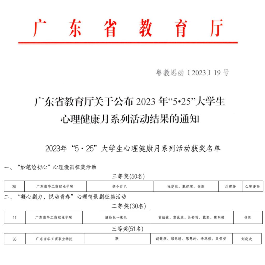 近日,广东省教育厅公布 2023 年“5·25”大学生心理健康月系列活动获奖名单,在本年度的心理健康月系列活动中我校荣获多个奖项。其中在“妙笔绘初心”心理漫画征集活动中,建艺学院刘宏奋老师指导的作品《俩个自己》(作者:程楚洪、戴舒琪、谢朗)荣获三等奖; 在“凝心剧力,悦动青春 ”心理情景剧征集活动中,数创学院杨帆老师指导的作品《请给我一束光》(作者:黄丽敏、黎泳欣、吴舒茵、戴熙、陈明微)荣获二等奖,文旅学院刘晓欢老师指导的作品《默》(作者:胡银燕、郑思晴、陈慧玲、李恩榕、吴莹莹) 荣获三等奖。