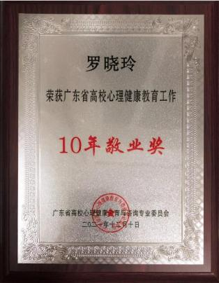 近日,广东省高校心理健康教育与咨询专业委员会公布 2020 - 2021 年度广东省高校心理健康教育与咨询工作 20 年奉献奖、10 年敬业奖名单,我校心理辅导中心罗晓玲老师荣获 10 年敬业奖荣誉。这是继刘丽老师获得广东省高校大学生心理健康教育教学基本功比赛二等奖后,我校教师今年在广东高校心理健康咨询与健康工作领域获得的又一荣誉。