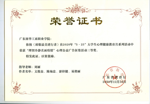 近日,我校财务金融学院刘丽老师指导,文俊杰、陈灿忠、游梓健、易艳丽同学的联合作品《致敬最美逆行者》在2020年广东省高校“5.25”大学生心理健康教育月系列活动中荣获“理智冷静直面疫情”心理公益广告征集活动三等奖。