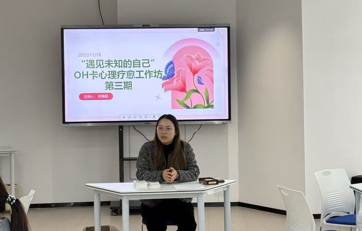 11月18日,大学生心理健康教育与咨询中心举办第三期心理疗愈工作坊——“遇见未知的自己”(OH卡)。本次活动特邀心理导师岑锦明主持,吸引20余名学生沉浸式参与,共同开启一场与内在自我的深度对话。