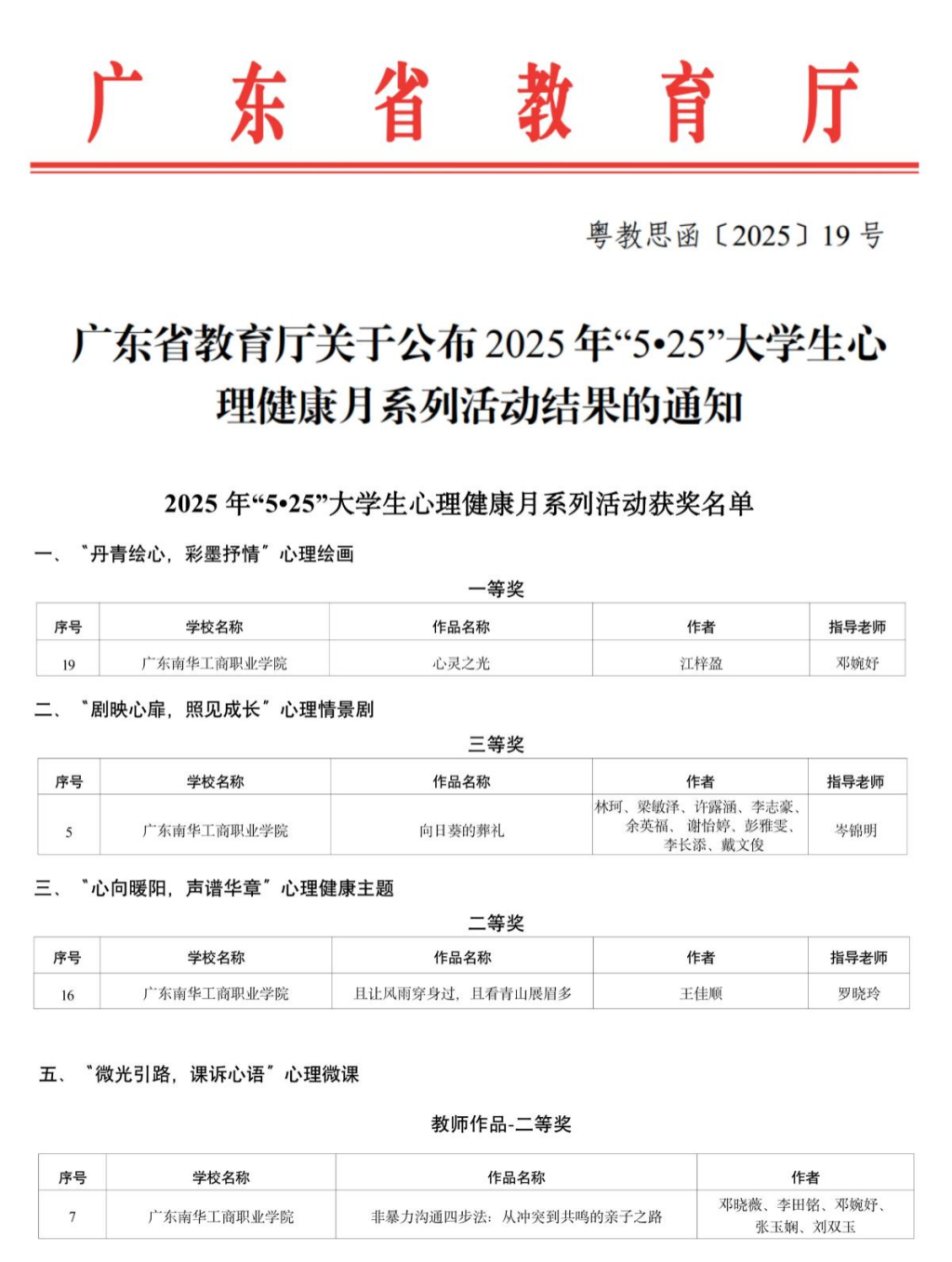 喜报!我校师生作品在广东省教育厅2025 年“5·25” 大学生心理健康月系列活动中荣获佳绩