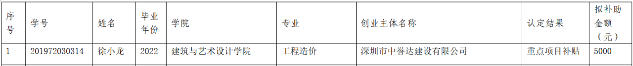 根据《广东南华工商职业学院进一步稳定和促进就业工作的十条措施 (2021)》(粤工院办〔202115号)、《广东南华工商职业学院稳定和促进毕业生就业专项资金管理办法(试行)》(粤工院办〔202135号)相关规定,毕业生就业指导中心组织了面向20212022届毕业生的一次性创业资助申报工作,并于20221117日进行公示。经反馈、确认,现将建筑与艺术设计学院工程造价2022届毕业生徐小龙的材料进行更正、公示。