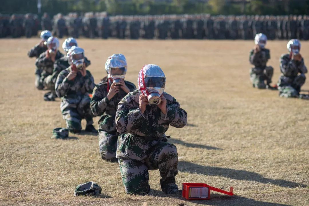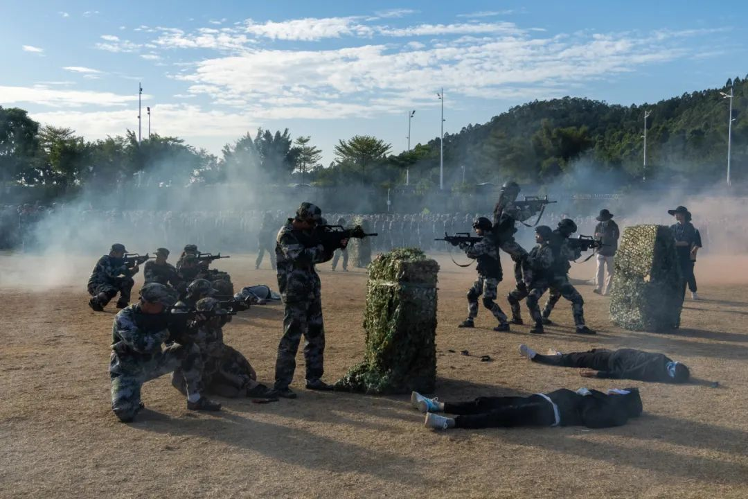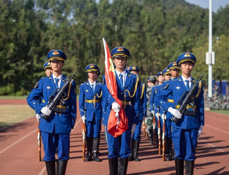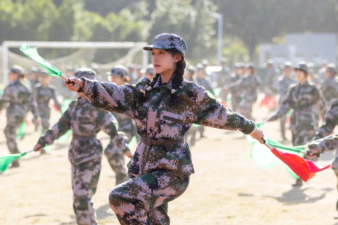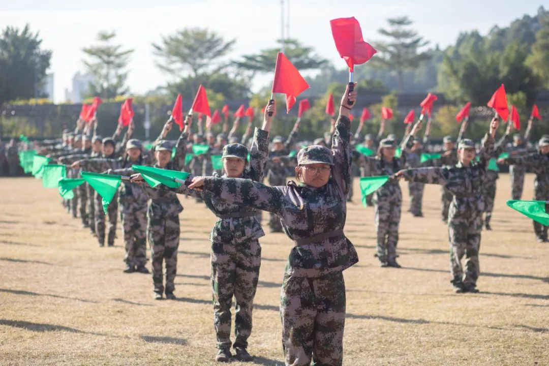 军训汇演正式开始,迎军训团团旗、分列式、擒敌拳、匕首操、旗语操演练、消防救援演练、花样演练、反恐战术演练、国家手语操等,表达师生对党和祖国的忠诚与祝福。