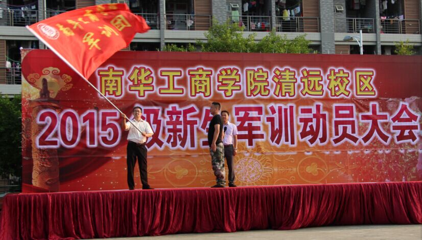 首先,院长助理、清远校区综合办韦秀华主任代表学院向承训单位授“南华工商学院军训团团旗”,承训单位——广州市军地文化传播有限公司许天龙队长代表承训单位接旗。