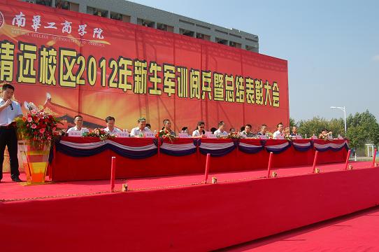 2012928上午,清远校区2012级新生军训阅兵暨总结表彰大会在足球场隆重举行。莅临本次大会的领导和嘉宾有:中国人民解放军75734部队政治部文培才主任、训练队叶卫华队长,学院院长易江博士,学院周桂兰副院长,院长助理兼清远校区综合办主任郭记中教授,教务处韦秀华处长,财务处李若旋处长,学生党总支常立威书记,学生处张朝山处长,国贸系李中原主任、党总支许典榕副书记,环艺系戴碧锋主任、袁龙如副主任,计算机系肖伟主任、唐永红副主任,管理系李新副主任,金融系党总支赵玲霞副书记。大会由院团委陆飞宇副书记主持。