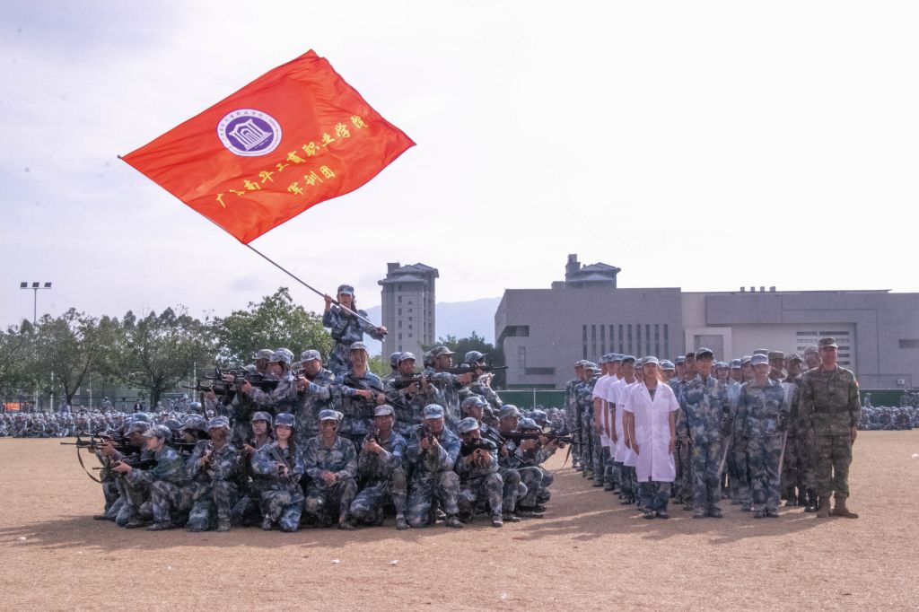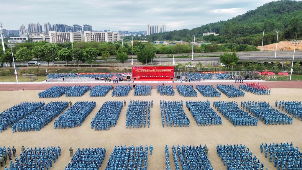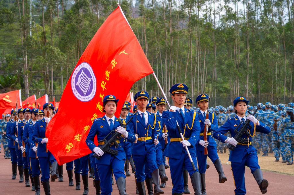 党委委员李新,黄埔区人武部干事吴保蛟,军训团团长林子恒,招生与对外合作交流处副处长杨盛华,各二级学院学生工作负责人,党委学生工作部与校团委全体人员,2024级新生带班辅导员,全体教官和4710名受训新生参加大会。