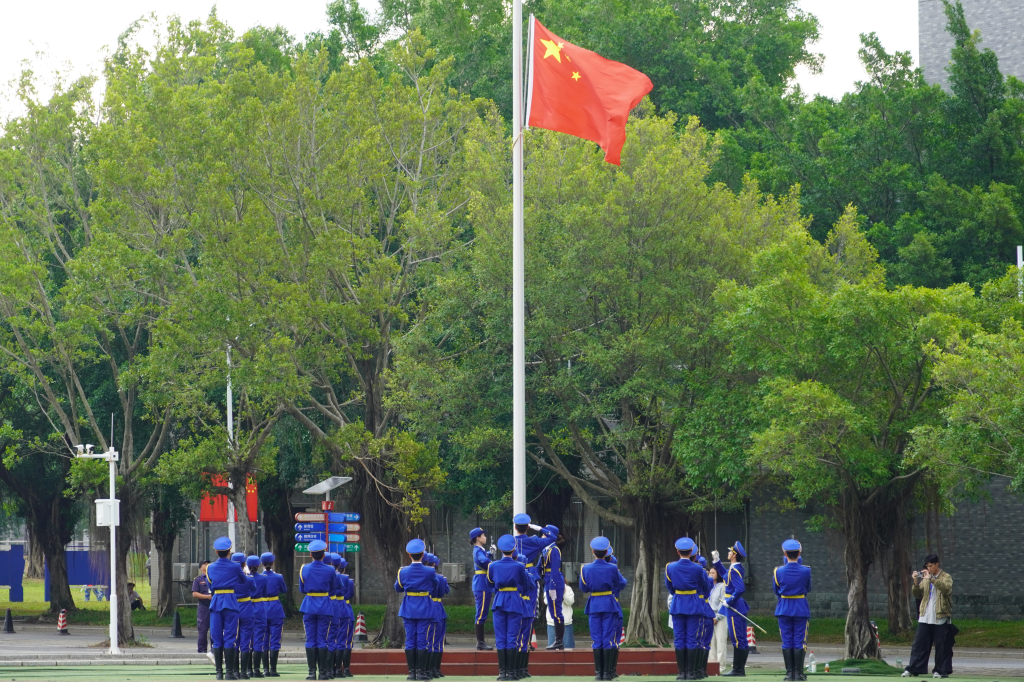 伴随着响亮的口令,《义勇军进行曲》奏响,国旗冉冉升起,军训成果汇报暨总结表彰大会正式开始。