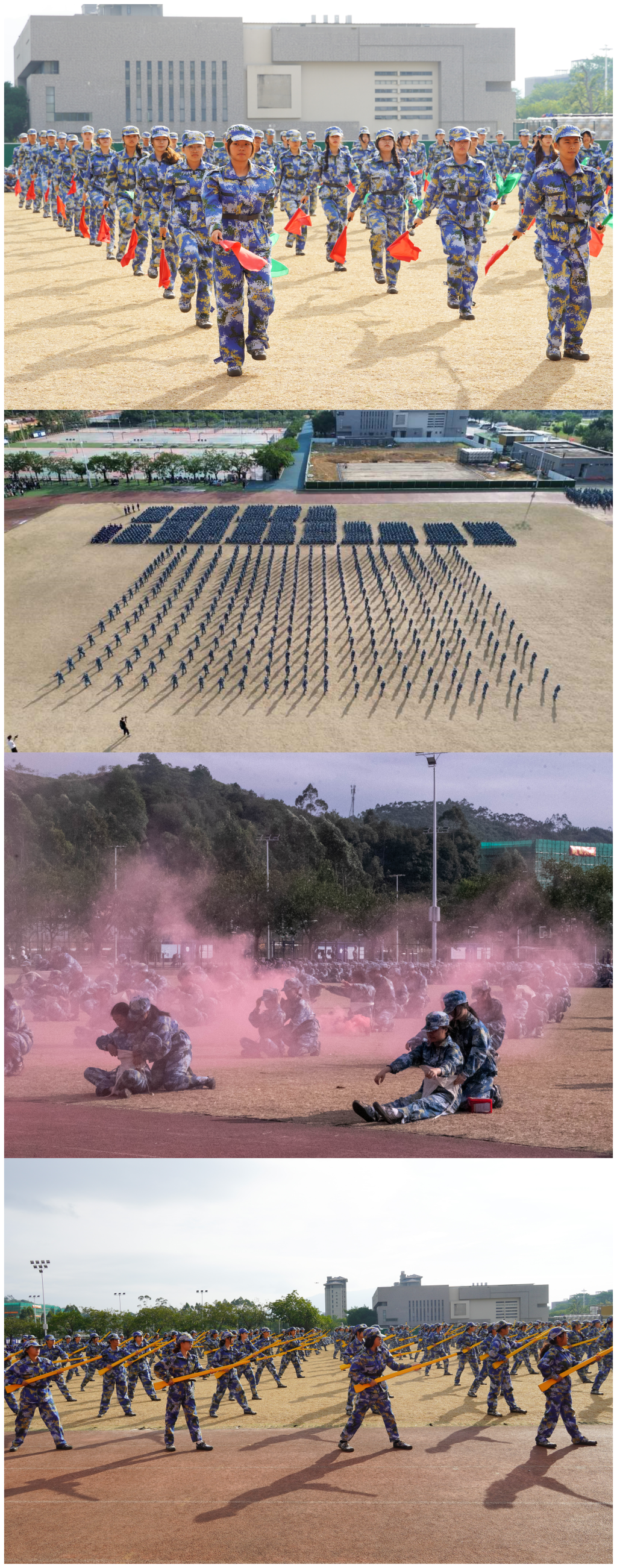《分列式进行曲》响彻训练场,全校5个营28个连的2024级学生口号响亮、步履铿锵,展现了南华学子朝气蓬勃、热情饱满的精神风貌。军训成果汇报展示中,军体拳的虎虎生风、撼天动地,匕首操的霸气十足、巧妙多变,短棍术的整齐划一、掷地有力,“一刺、一突、一击、一防”刺杀操的凛凛杀气、威风八面,战场止血、包扎、固定、搬运、心肺复苏等救护演练的紧张有序、精准高效,旗语操的整齐划一、动感明快,反恐战术的随机应变、步步为营……掀起了军训汇报表演一个又一个高潮,充分展现了受训新生的训练成果,得到了全场观众的热烈掌声。