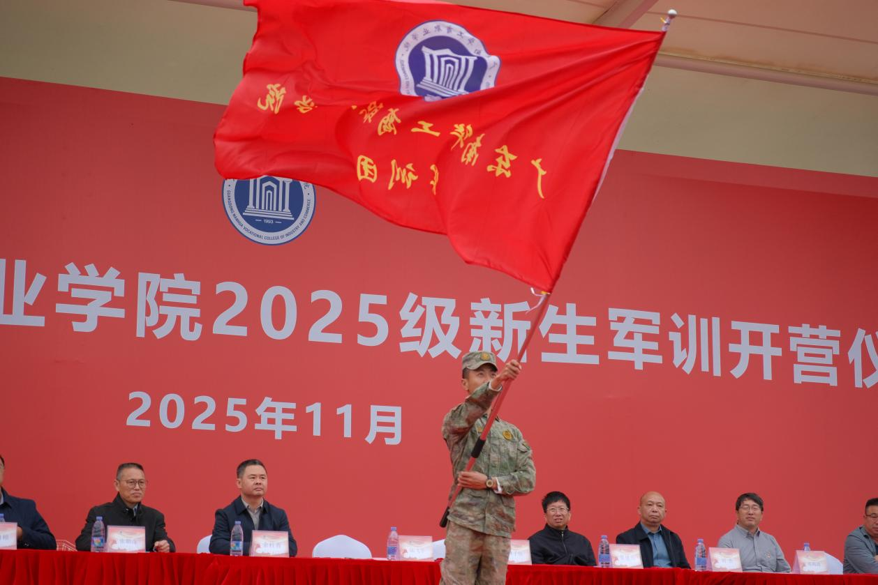 仪式上,军训团负责人接过团旗并挥舞致意,鲜红的旗帜不仅是荣誉的象征,更是责任与担当的传递。2025级学生军训的号角正式吹响。