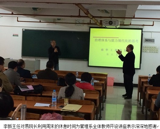 3月9日星期天上午,管理系举办第一期“商道讲坛”,邀请学院院长易江教授作题为“治理体系与能力现代化的思考”的专题讲座。管理系全体教师参加,讲座由系主任李新副教授主持。