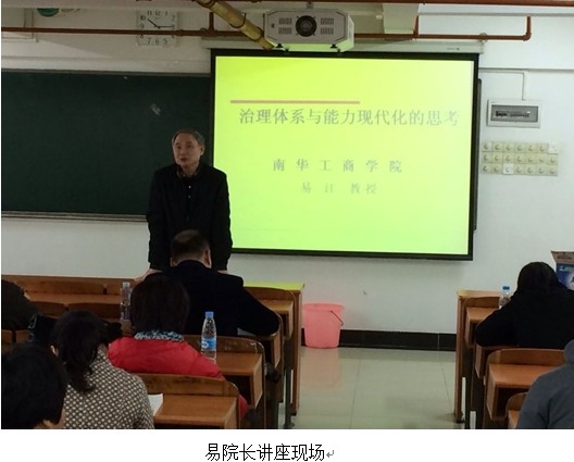 讲座中,易院长以“治理”的概念和所包含的三个方面为开场白,以倒逼的思维方式阐明了“治理现代化的提出”,最后深刻阐述了“国家治理体系与能力现代化”的目的和作用。易院长渊博的学识,幽默生动的语言,理论结合实际的内容,旁征博引、深入浅出,令教师们听得津津有味,现场掌声不断。两个小时的讲座过后,在场的聆听者仍意犹未尽。