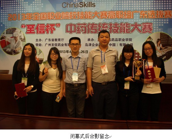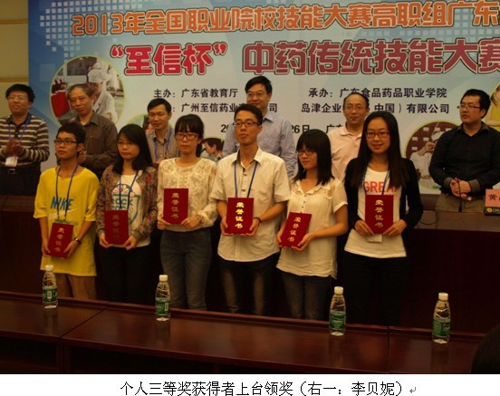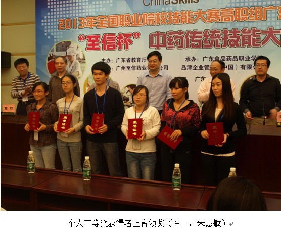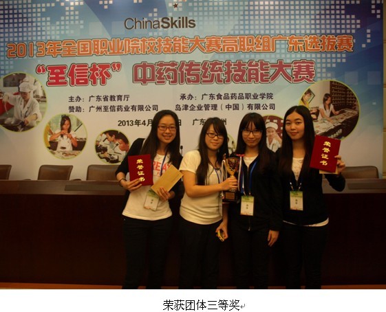 2013年4月25日至26日,由广东省高教厅主办、广东食品药品职业学院承办了“2013年全国职业院校技能大赛高职组广东选拔赛‘至信杯’中药传统技能大赛”。管理系以何沿主任为领队,以医药营销教研室安春志老师和王有志老师为指导老师,带领药品经营与管理、医药营销及公共营养师三个专业4名同学——朱惠敏、李贝妮、叶小贞、谢静——参加了比赛。经过激烈角逐,获得了团体三等奖,朱惠敏和李贝妮同学获得了个人三等奖的优异成绩。