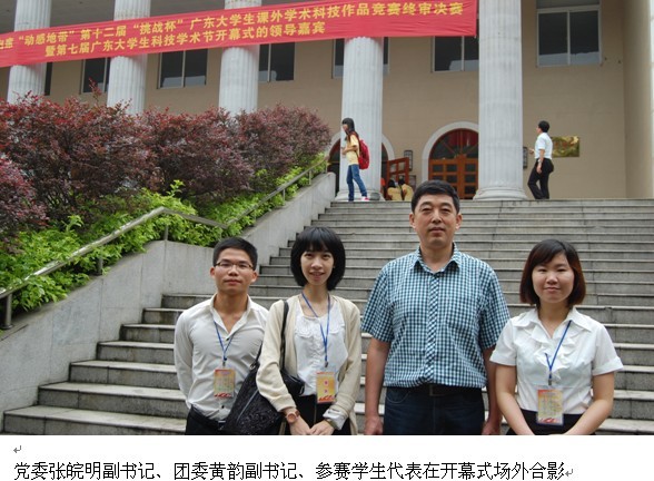 5月21日上午,“中国梦•青春创”“动感地带”第十二届“挑战杯”广东大学生课外学术科技作品竞赛终审决赛暨第七届广东大学生科技学术节开幕式在暨南大学大礼堂隆重举行,我院党委张皖明副书记、团委黄韵副书记以及参赛学生代表应邀参加了这场被誉为广东大学生科技创新的“奥林匹克”盛会。