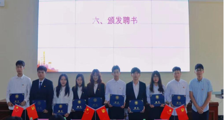 紧接着,信商学院党总支常务副书记郑海清、团委书记龙俏颖、副书记杨帆、辅导员吴文利分别为团委学生会学生干部颁发聘书。