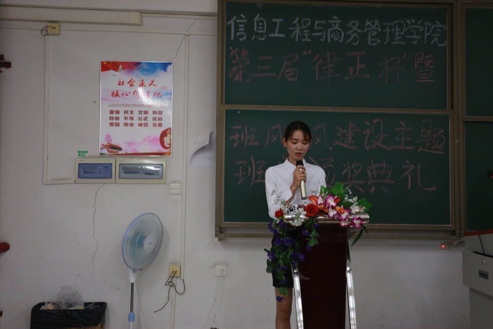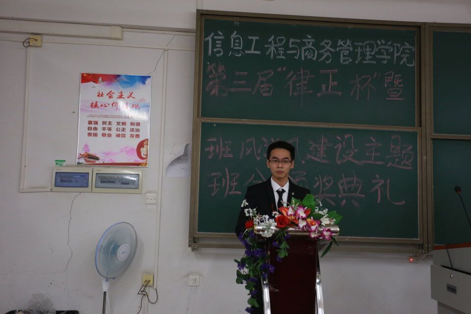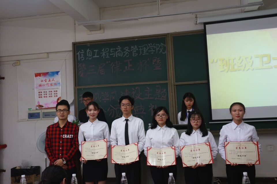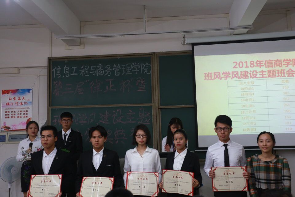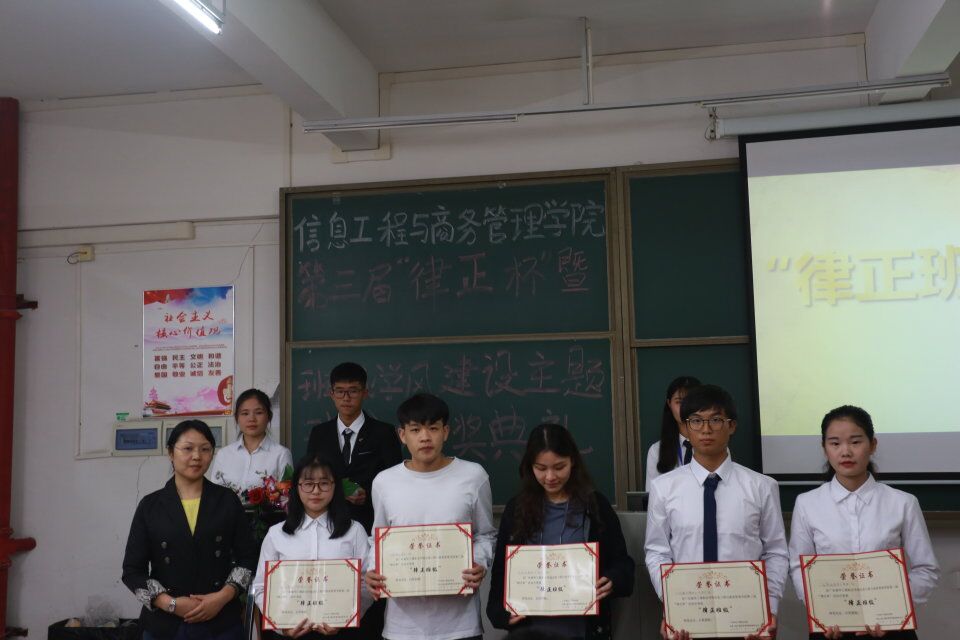 为了提高我院同学们的纪律意识,促进信息工程与商务管理学院班风学风建设,营造良好育人环境。为此信商学院于2018年12月5日晚7点在教学楼405举行信息工程与商务管理学院第三届律正杯暨班风学风建设主题班会颁奖典礼,以弘扬纪检正气,塑造优良校风。信商学院党总支副书记凌红老师、信商学院崔宁老师、翁洁洵老师、梁晓允老师、赖志聪老师、王奕老师出席了本次颁奖典礼。