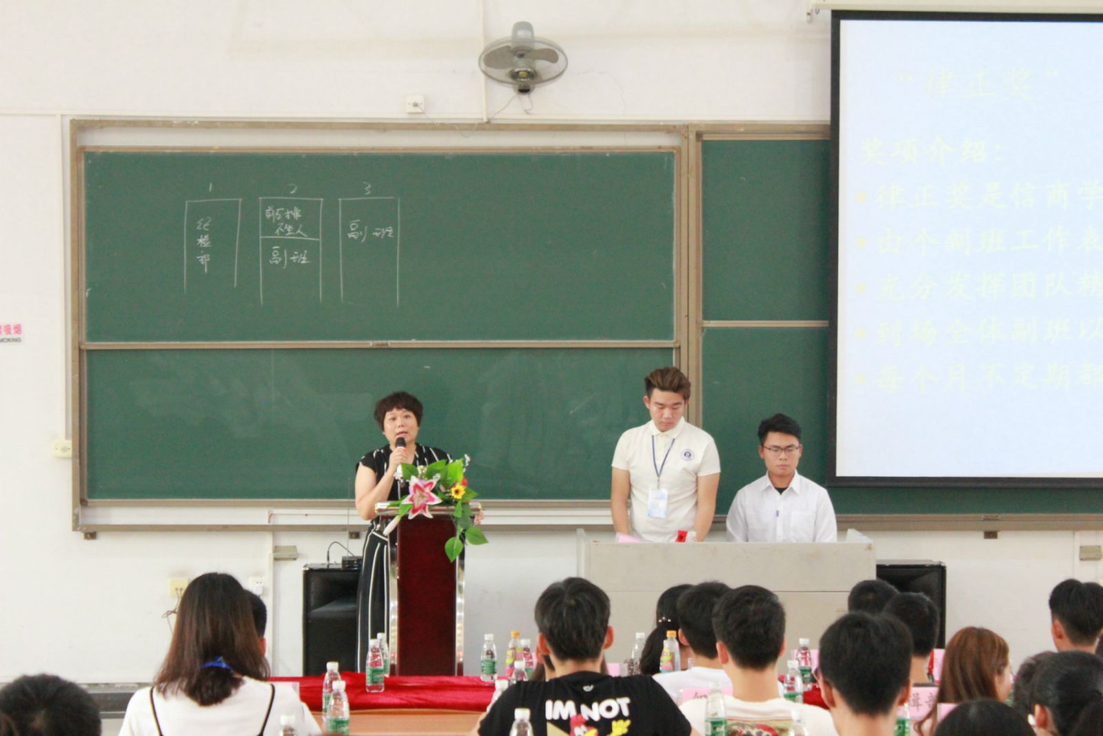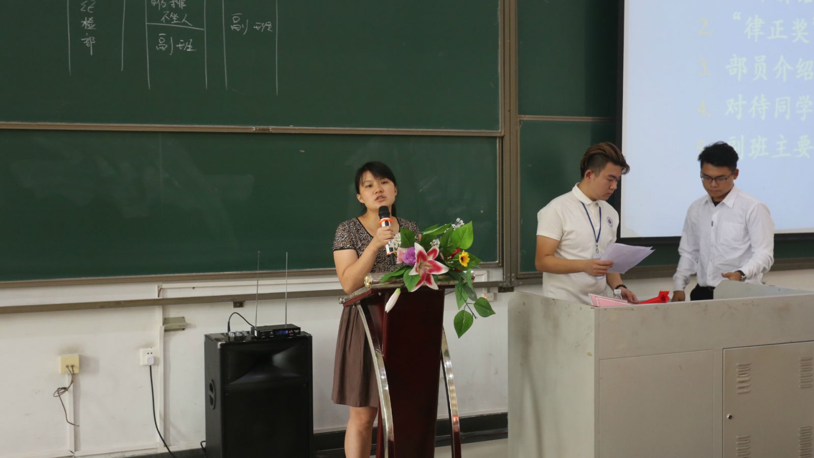 伴随着主持人热情洋溢的开场献词,纪检部部长杨志鹏上台宣布大会开始。大会伊始,章小剑老师发言。她发言中提到,此次活动是信商学院的学风建设的一大举措,也是支持与鼓励各副班工作的一大举措,希望这个活动能够长期有效的顺利开展并成为信商的品牌活动。在大家的掌声中,接着是陈清嫦老师的发言。她希望纪检部的干事们能做到公平公正、不偏不倚、不忘初衷,也为我们解释了律正的意义,并对同学们的考勤工作提出了具体地要求。大会有序地进行中,纪检部副部长刘雨萌介绍纪检部的干事们。