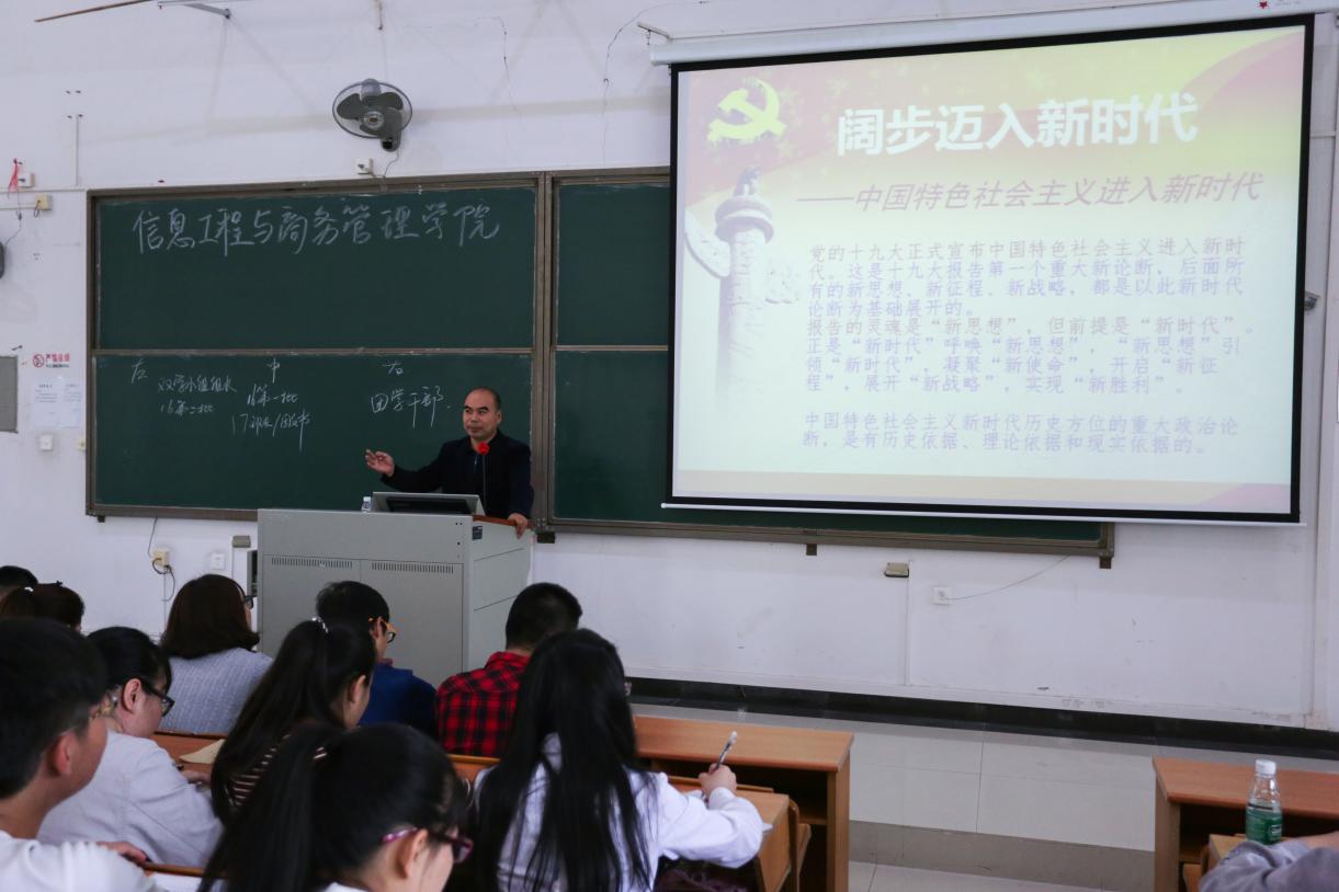 根据学校党委关于转发《广东省教育厅关于做好2018年春季学期高校党委书记、校长和院(系)党组织书记、院长(系主任)上第一堂思想政治课的通知》的通知要求,信商党总支李新书记于2018年3月28日中午12:30在清远校区101课室为信商学院186名学生上第一堂思想政治课。信商学院邱州鹏、章小剑、袁小梅、王一如、陈华毅、陈华、崔宁、李宇清等党员老师也到场听课。
