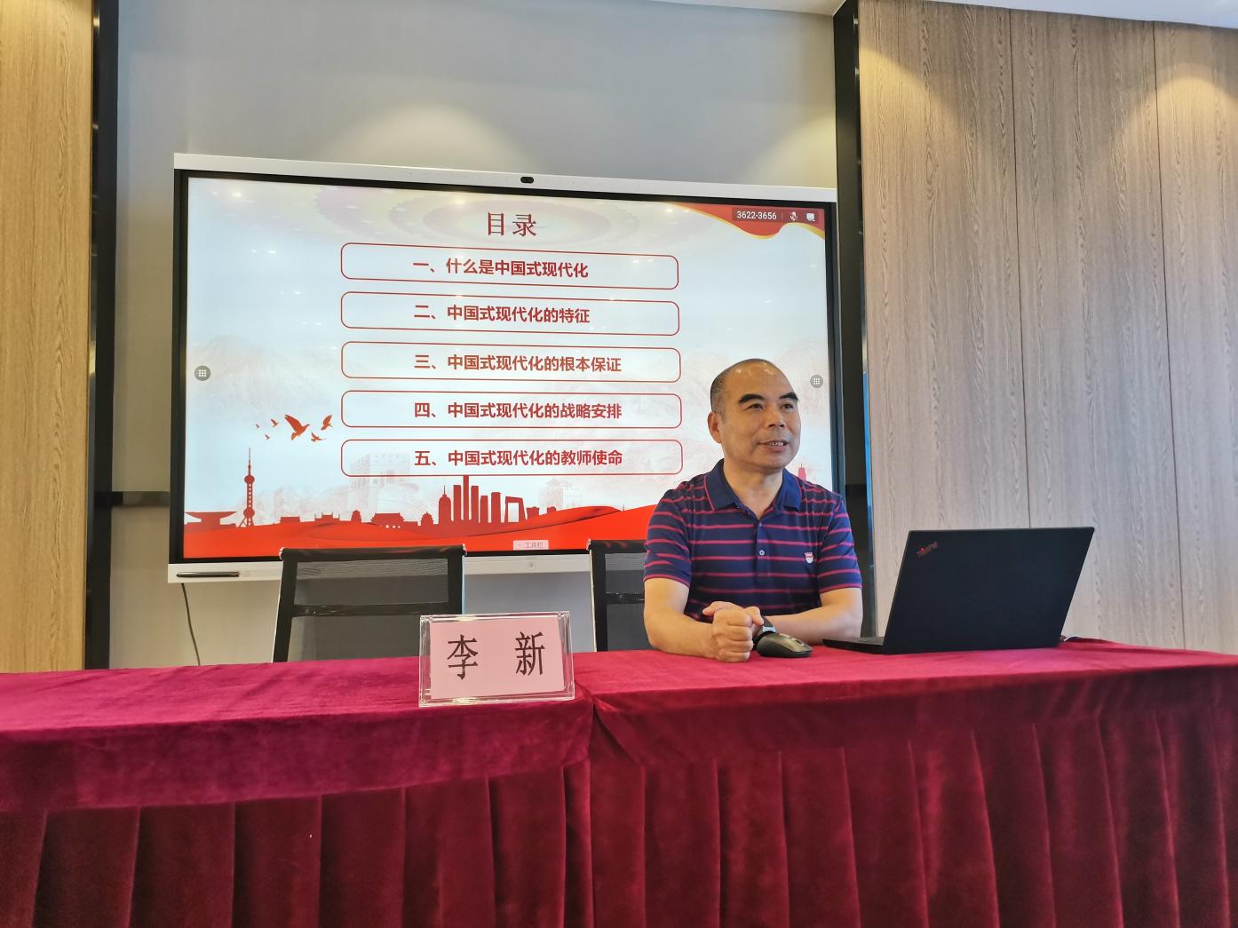 李新书记以“红心向党 筑梦前行——坚持以中国式现代化推进中华民族伟大复兴而努力学习工作”为主题,围绕什么是中国式现代化、中国式现代化的特征、中国式现代化的根本保证、中国式现代化的战略安排和中国式现代化的教师使命五个方面授课,通过授课,使得大家深刻体会到中国式现代化,是一项前无古人的开创性事业,必然会遇到各种可以预料和难以预料的风险挑战、艰难险阻甚至惊涛骇浪,必须增强忧患意识,坚持底线思维,居安思危、未雨绸缪,敢于斗争、善于斗争,通过顽强斗争打开事业发展新天地。