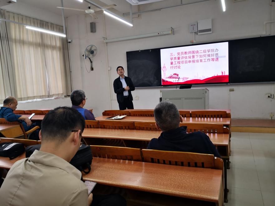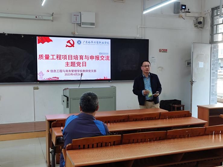 2023年4月26日下午,信息工程与商务管理学院教师党支部组织开展了以“质量工程项目培育与申报交流”为主题的党日活动。活动在学校清远校区教学楼317进行,信商学院教师党支部全体党员参会,会议还邀请了教务处李维仲副处长,以及信商学院杨家成副院长共同参与。