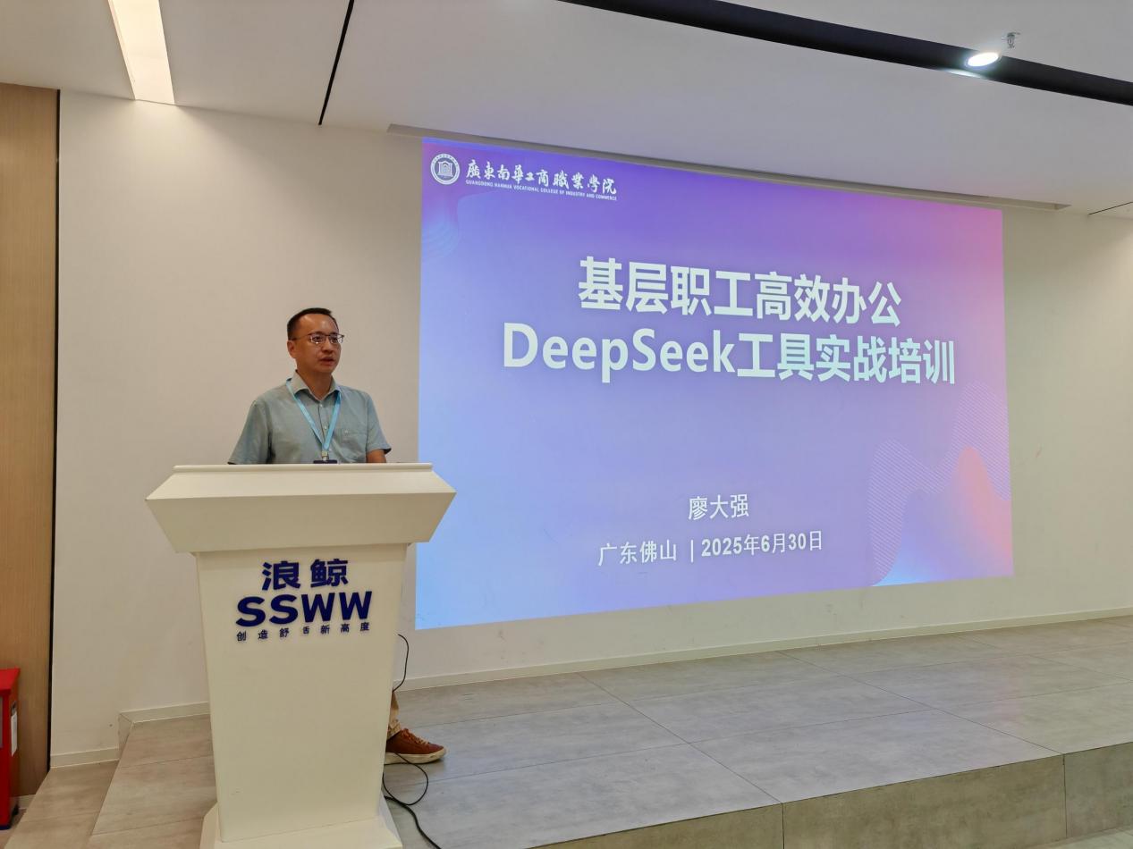 6月,人工智能学院受广东工匠学院委托,在广东新昇电业科技股份有限公司、佛山市鼎和盛汽配件有限公司、广东浪鲸智能卫浴有限公司、百威(佛山)啤酒有限公司,开展“基层职工高效办公DeepSeek工具实战培训”。此次培训以党建为引领,聚焦基层职工办公技能提升,共吸引189名职工参与,为企业数字化转型注入红色动能。