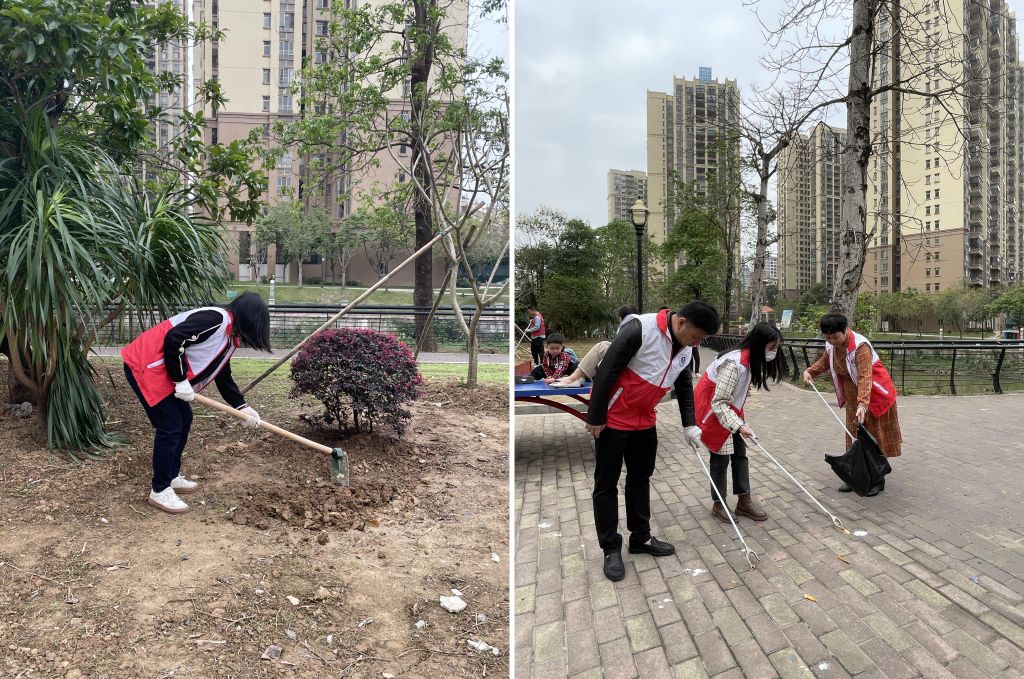 随后,党支部全体成员带着夹子、扫把、垃圾袋铲子、锄头等劳动工具,到社区周边的居民区开展了环境绿化工作。