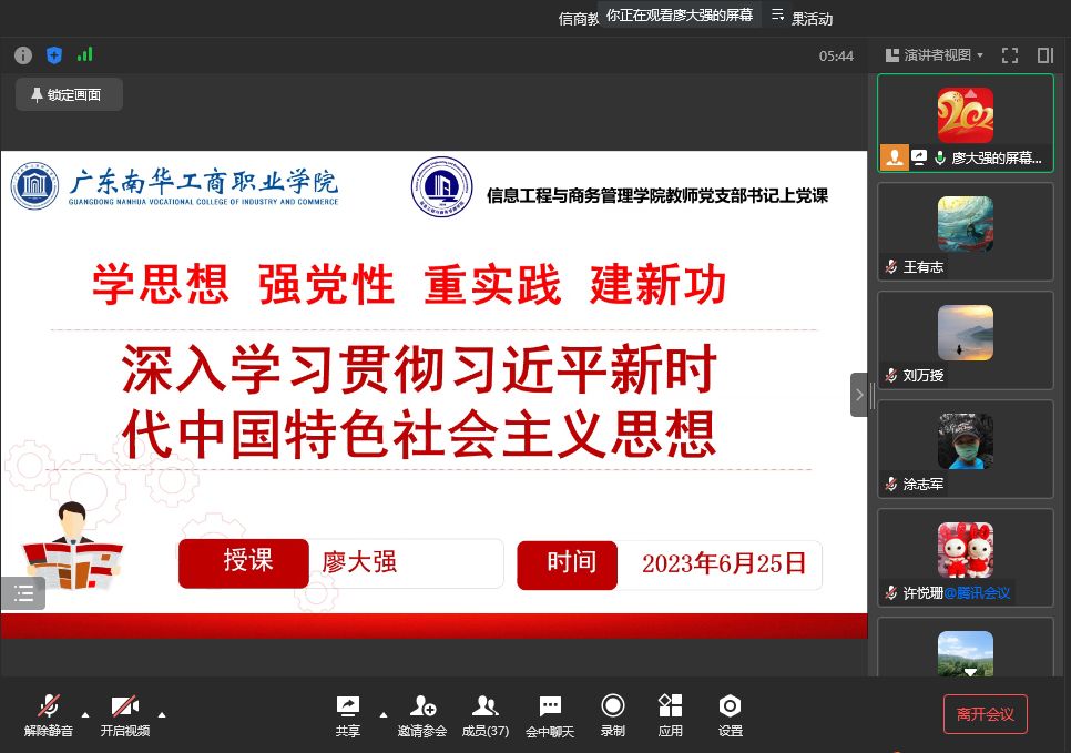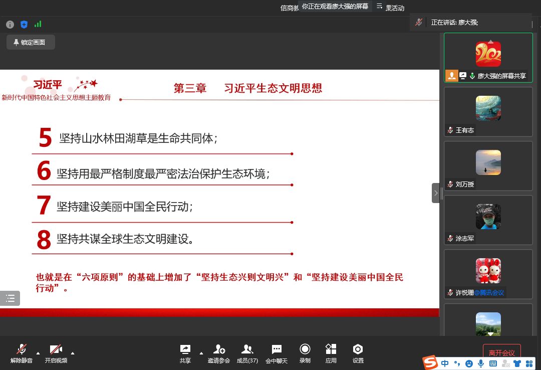信息工程与商务管理学院教师党支部书记廖大强于2023年6月25日通过企业微信会议以“深入学习习近平新时代中国特色社会主义思想”为主题进行了党课授课。廖大强书记从“坚持山水林田湖草是生命共同体”、“坚持用最严格制度最严密法制保护生态环境”、“坚持建设美丽中国全民行动”等主题进行了授课。